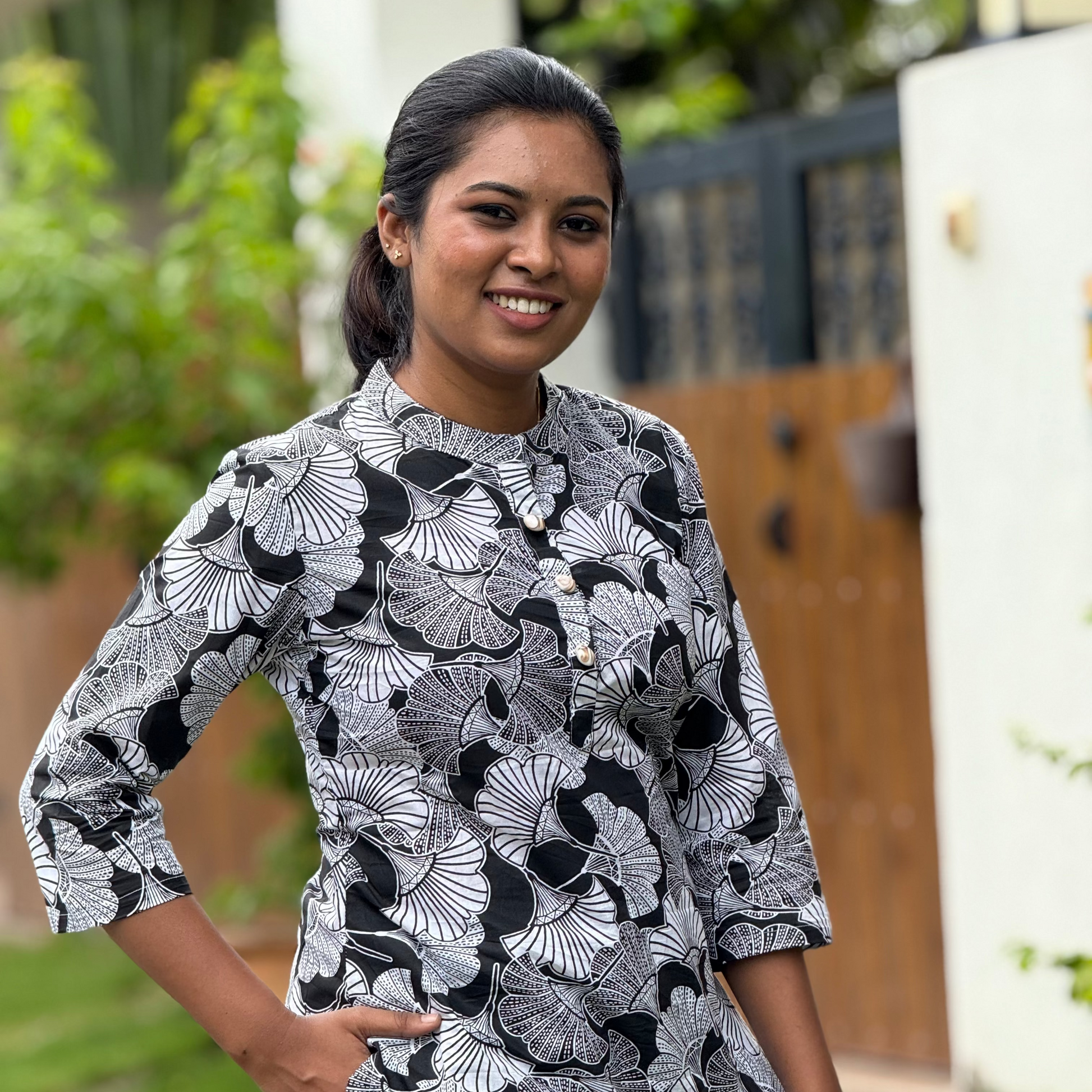 Description: A stylish collared top that falls above the knee, paired with a straight-cut bottom with pocket. The elegant ginkgo pattern adds a trendy yet timeless charm to your look.