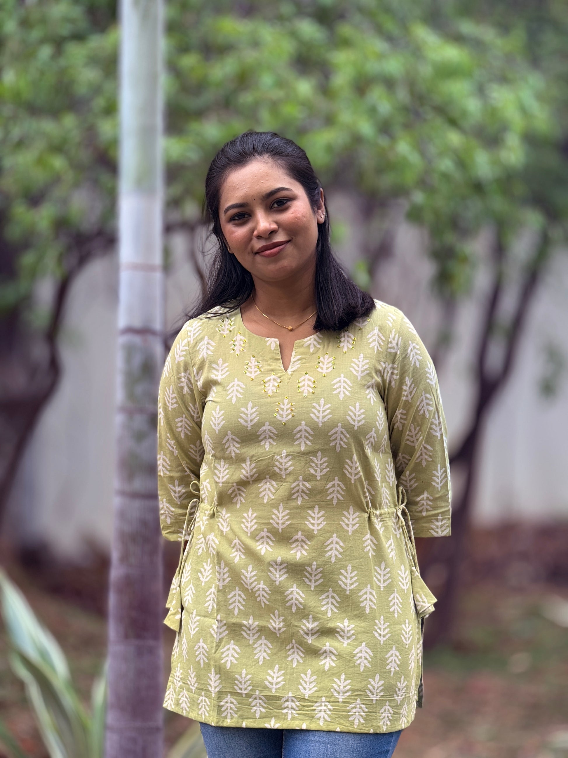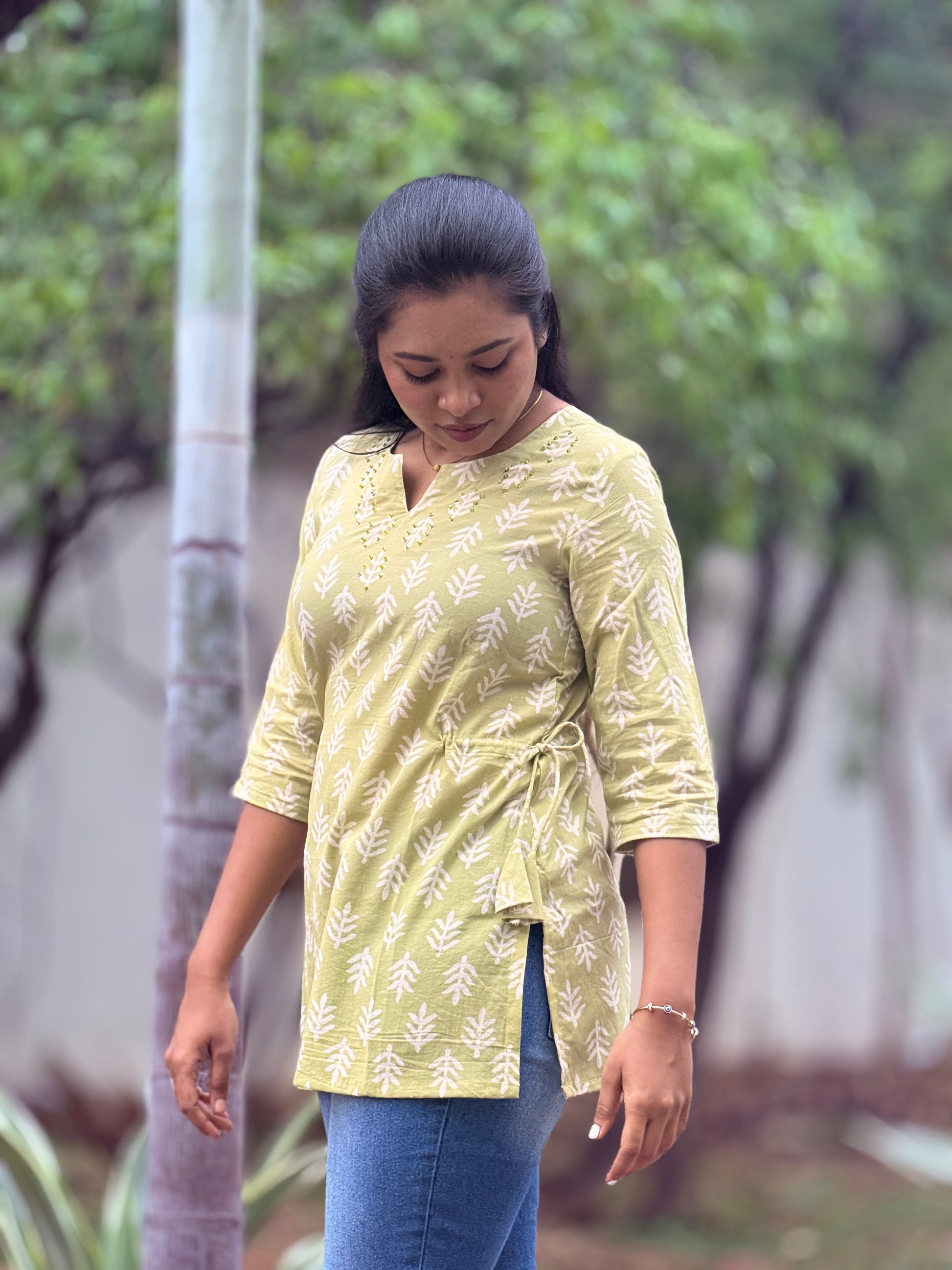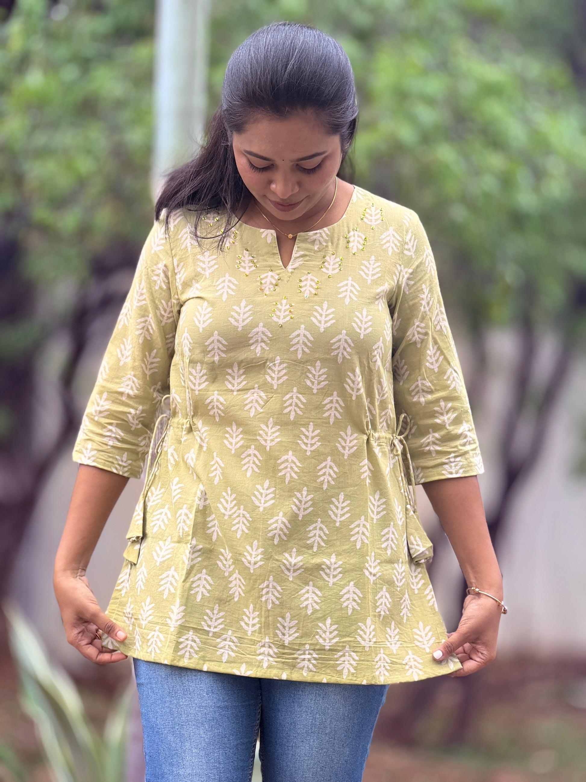 Description: A stylish jean top featuring a small V-neckline adorned with bead and sequin floral work, complete with adjustable knots at both hips. Falls gracefully till the thighs for a chic and versatile casual look.
