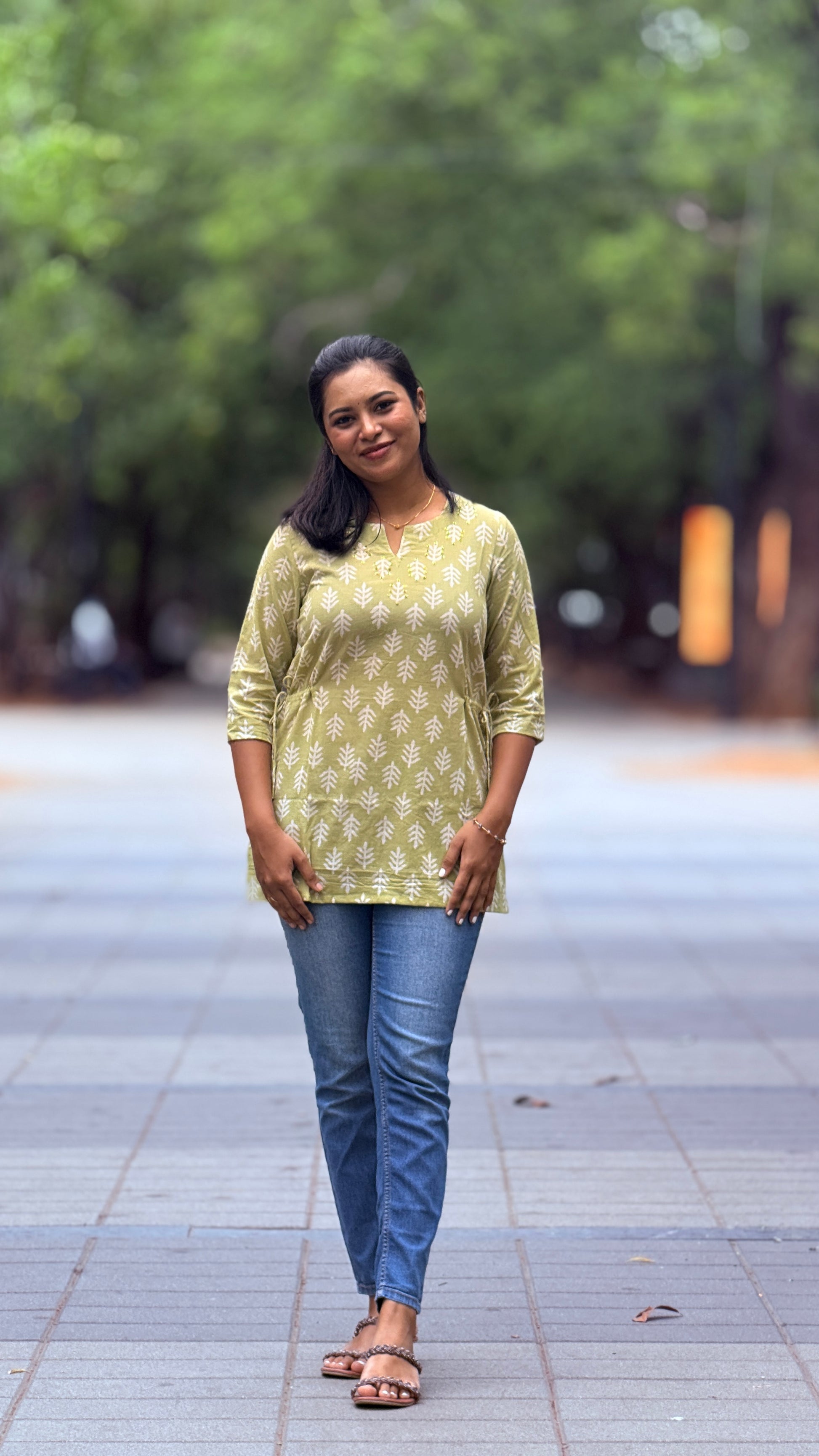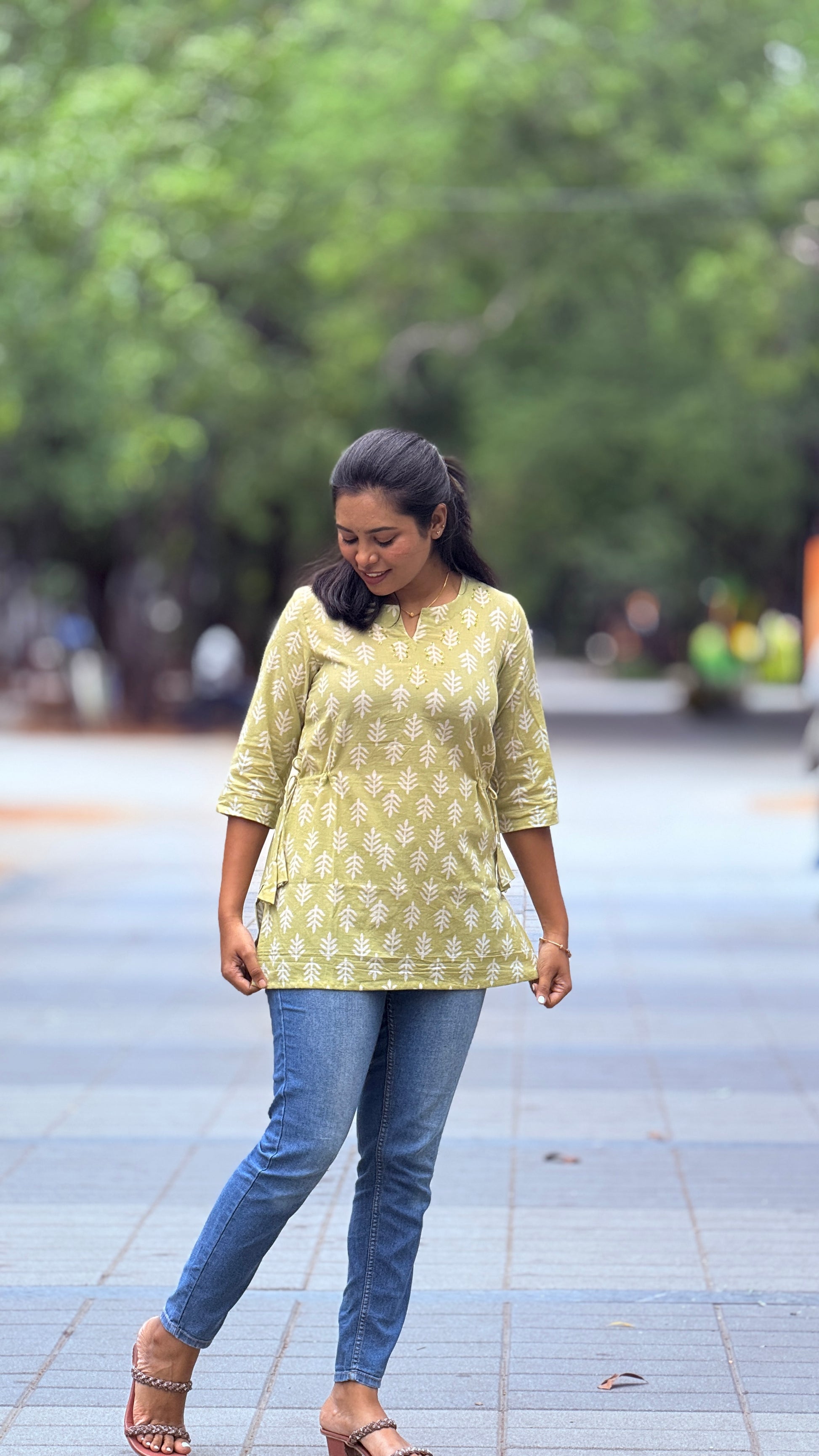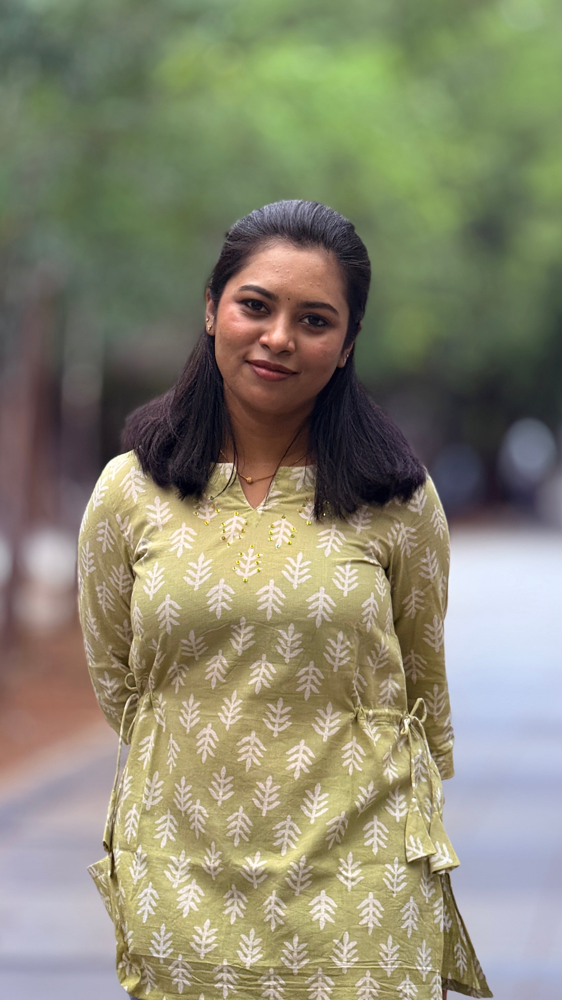 Description: A stylish jean top featuring a small V-neckline adorned with bead and sequin floral work, complete with adjustable knots at both hips. Falls gracefully till the thighs for a chic and versatile casual look.