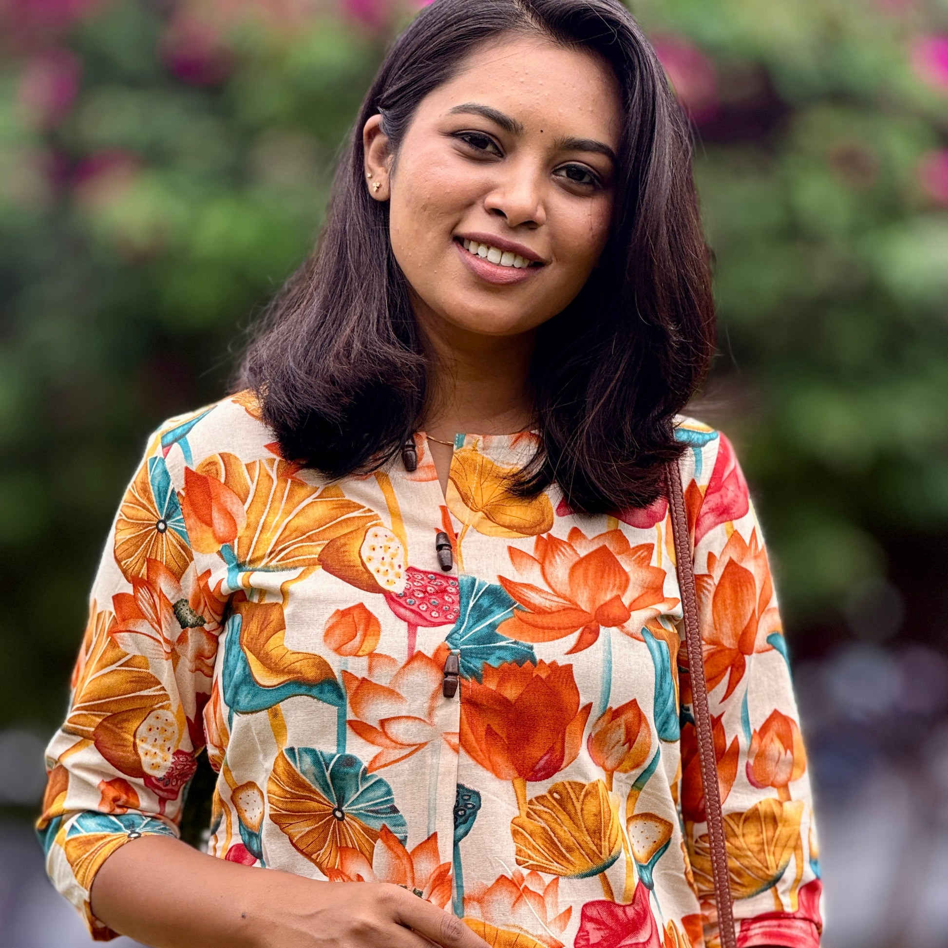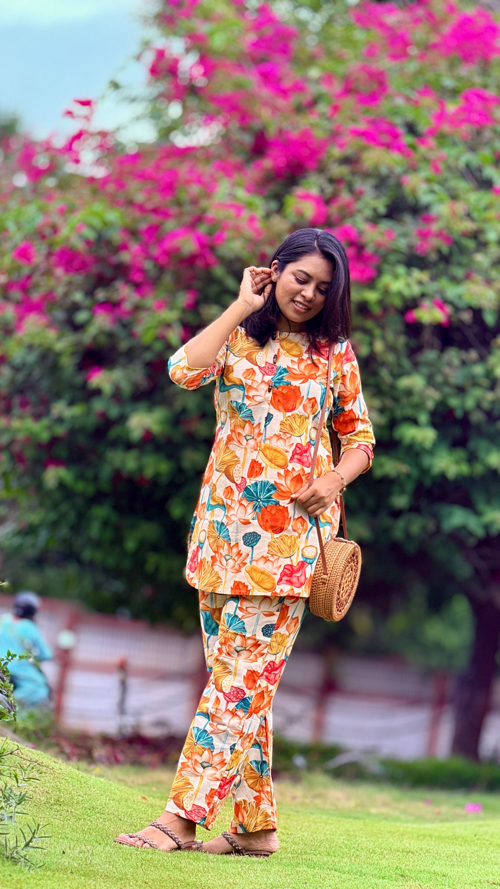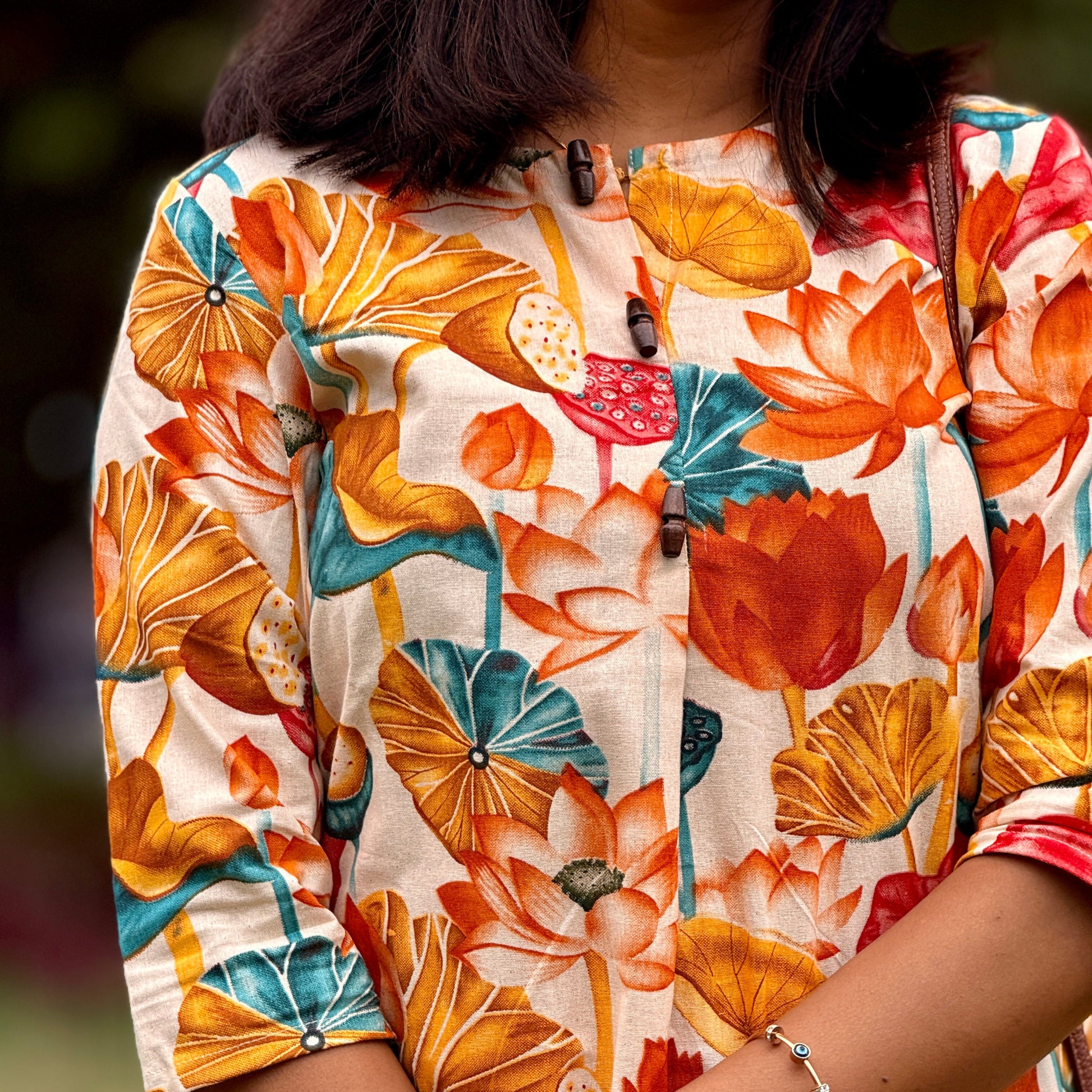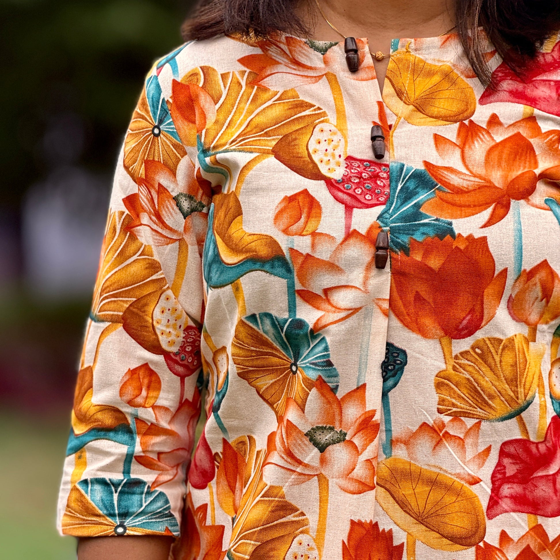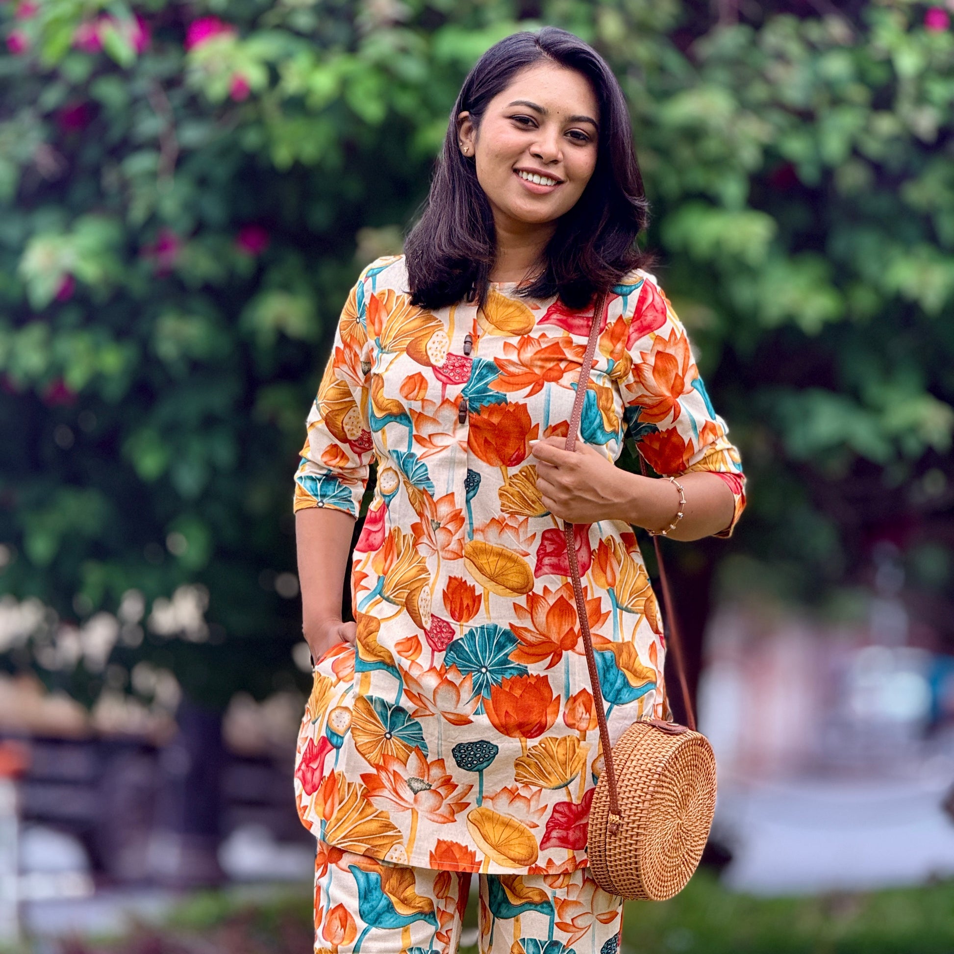 Description: A chic closed-neck top with an above-knee fit, paired with a straight-cut bottom with pockets. Enhanced with an artistic lotus pattern, it blends elegance with modern style.