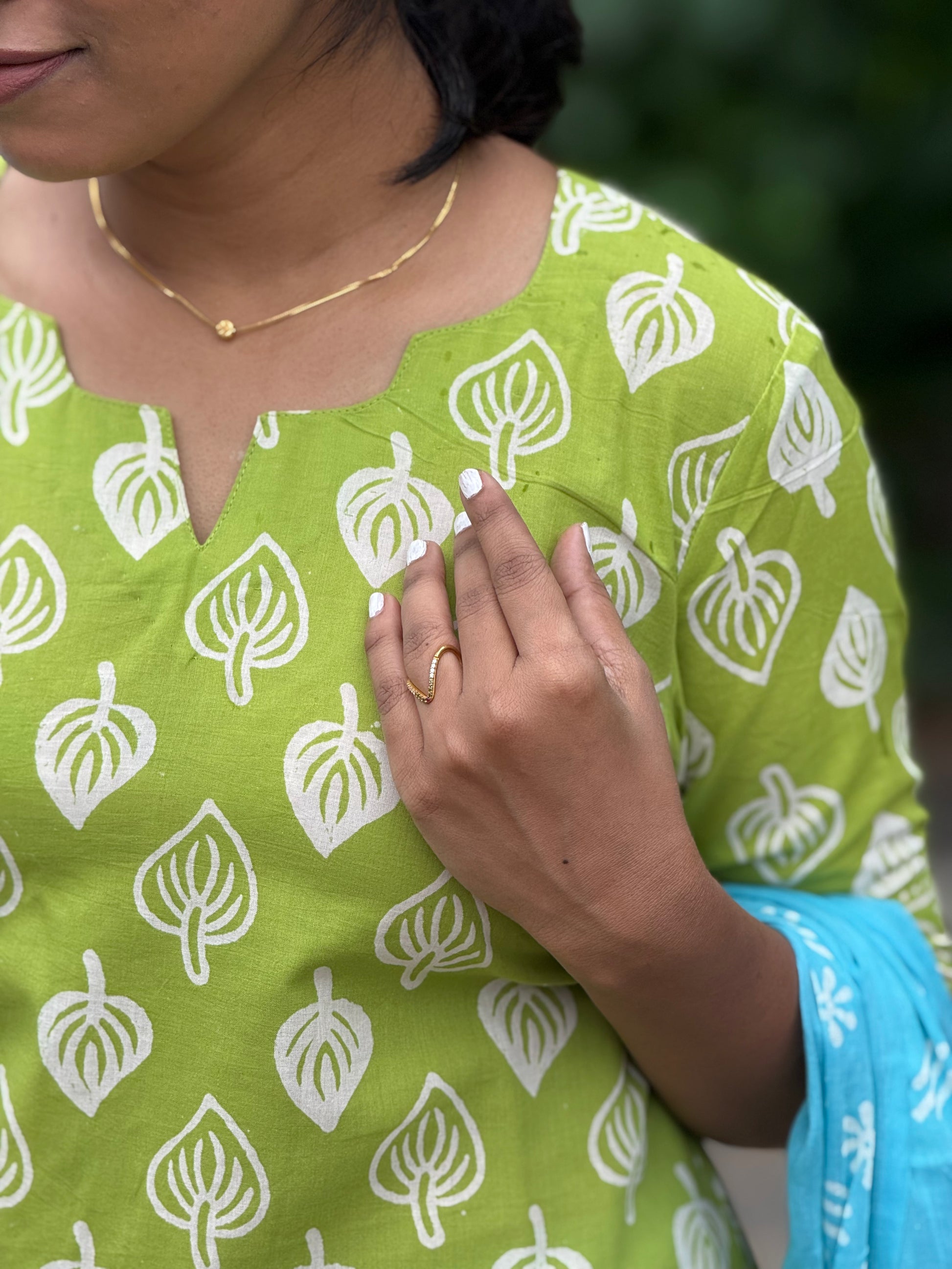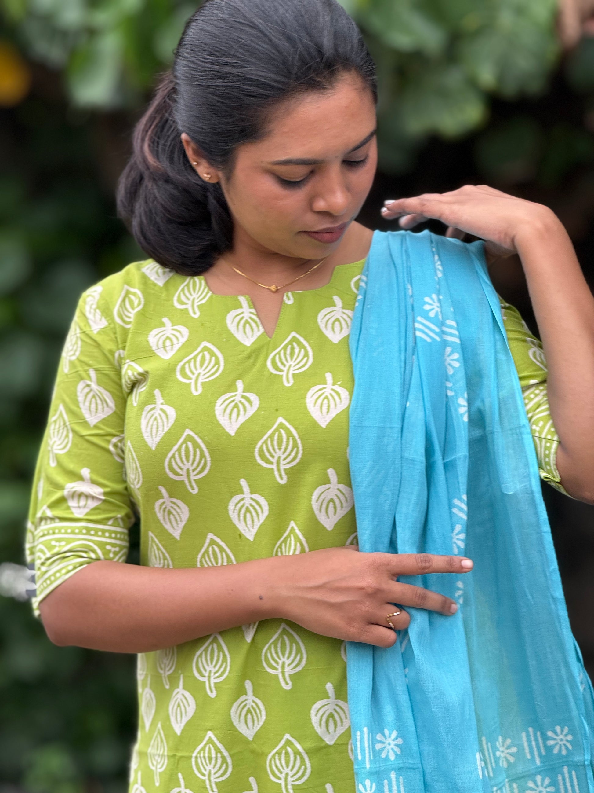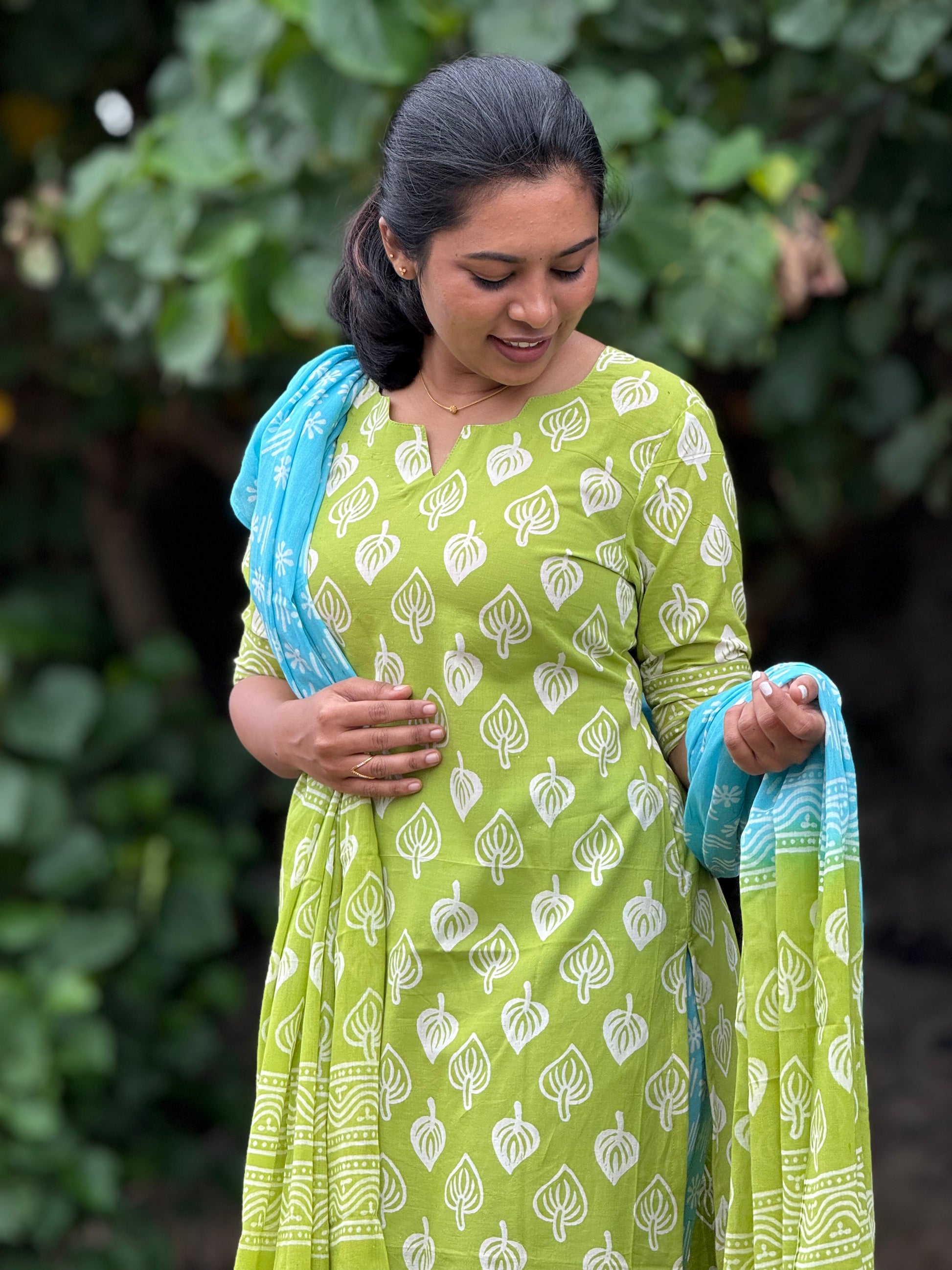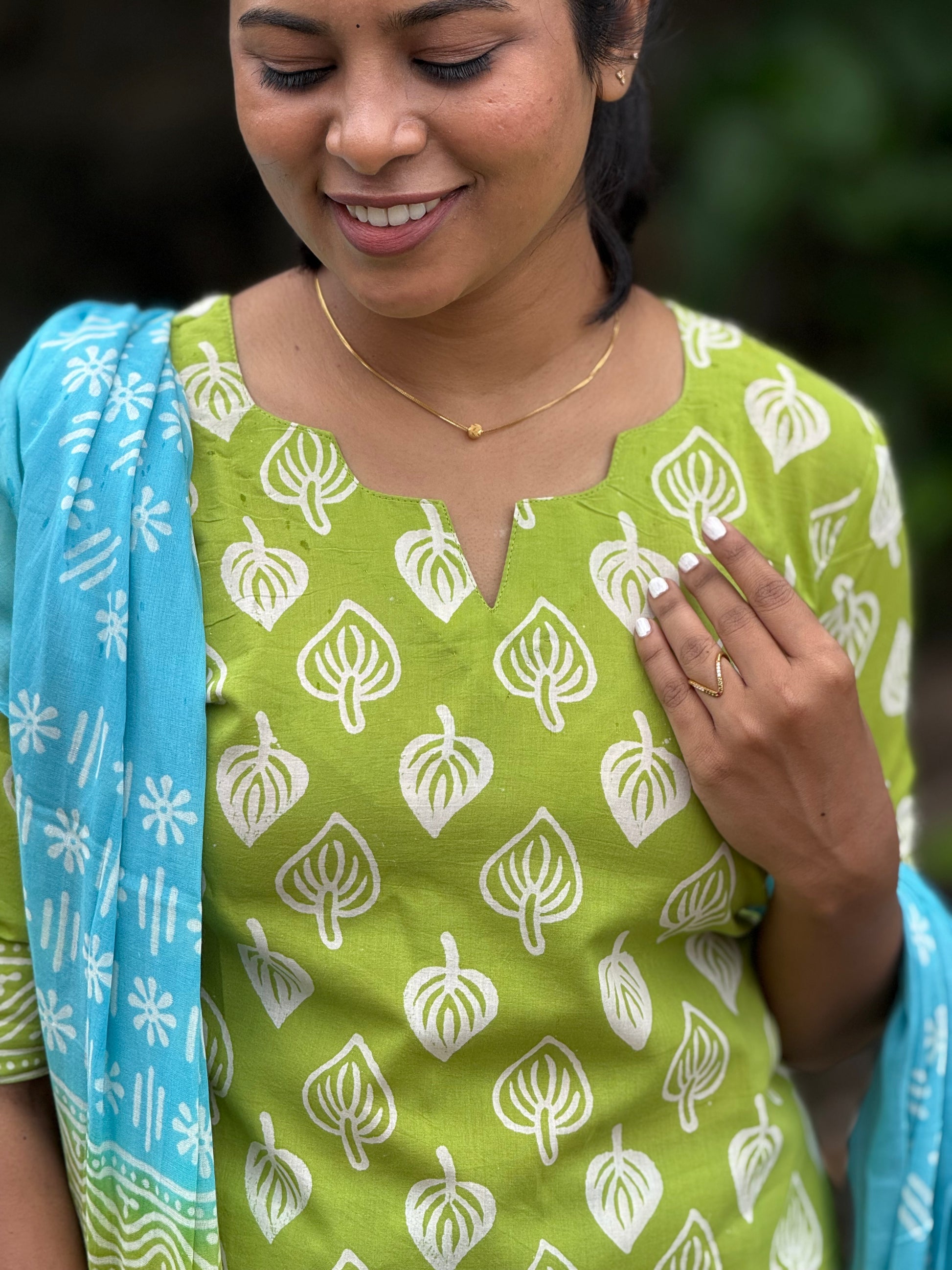 Description: A classic cotton salwar set with straight-cut pants, paired with a block-printed cotton dupatta. Featuring an elegant neckline, it combines everyday comfort with timeless style.