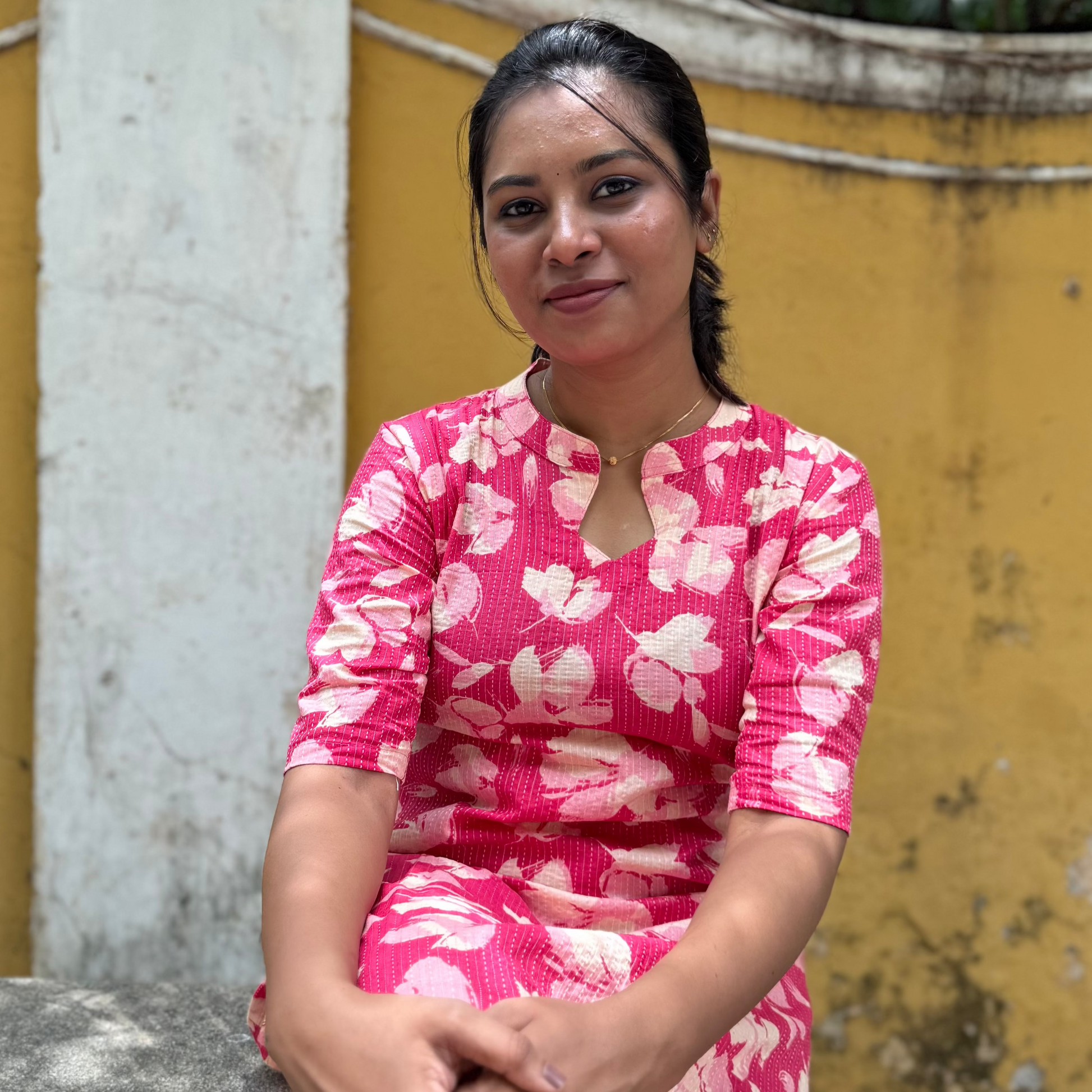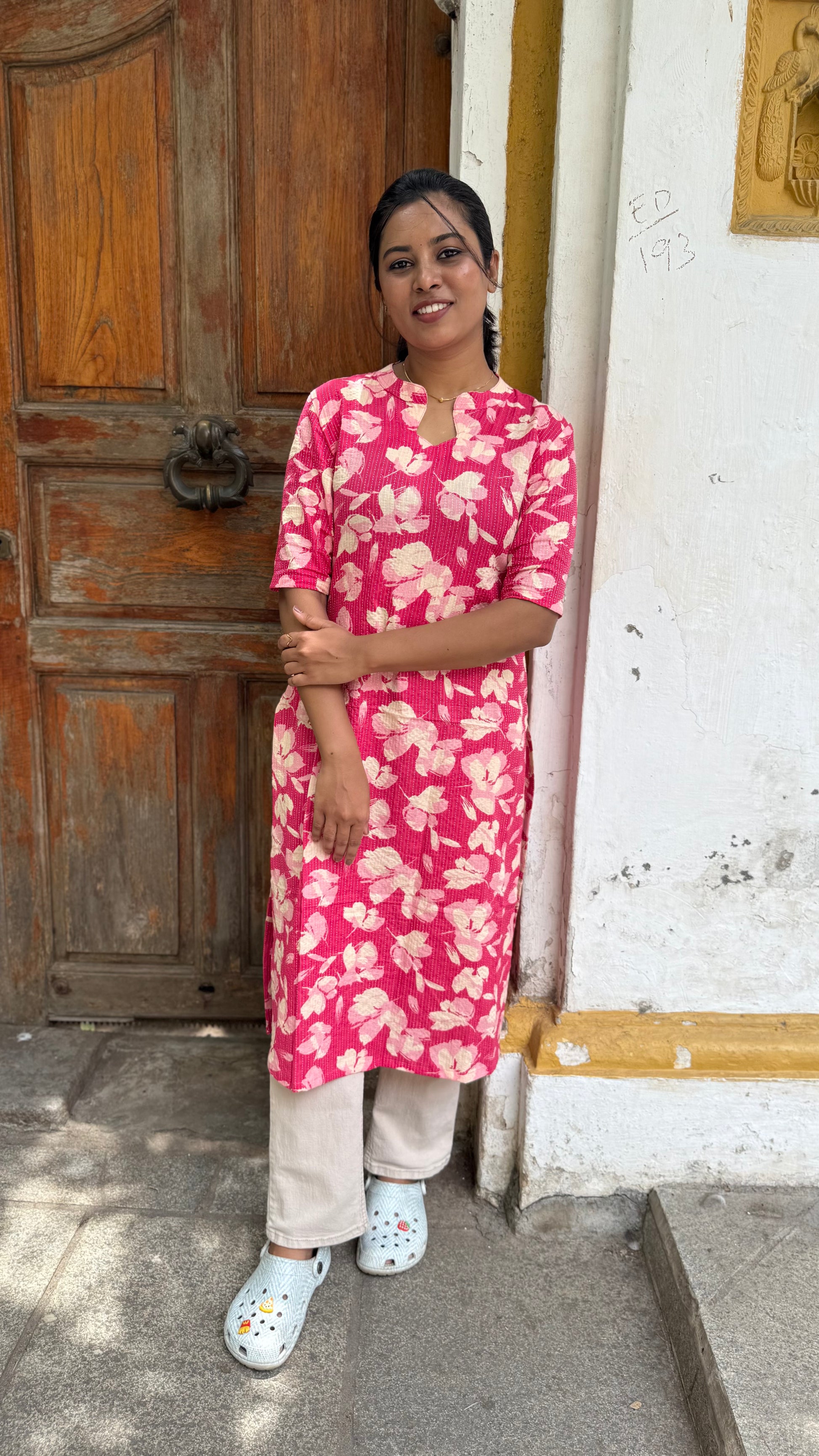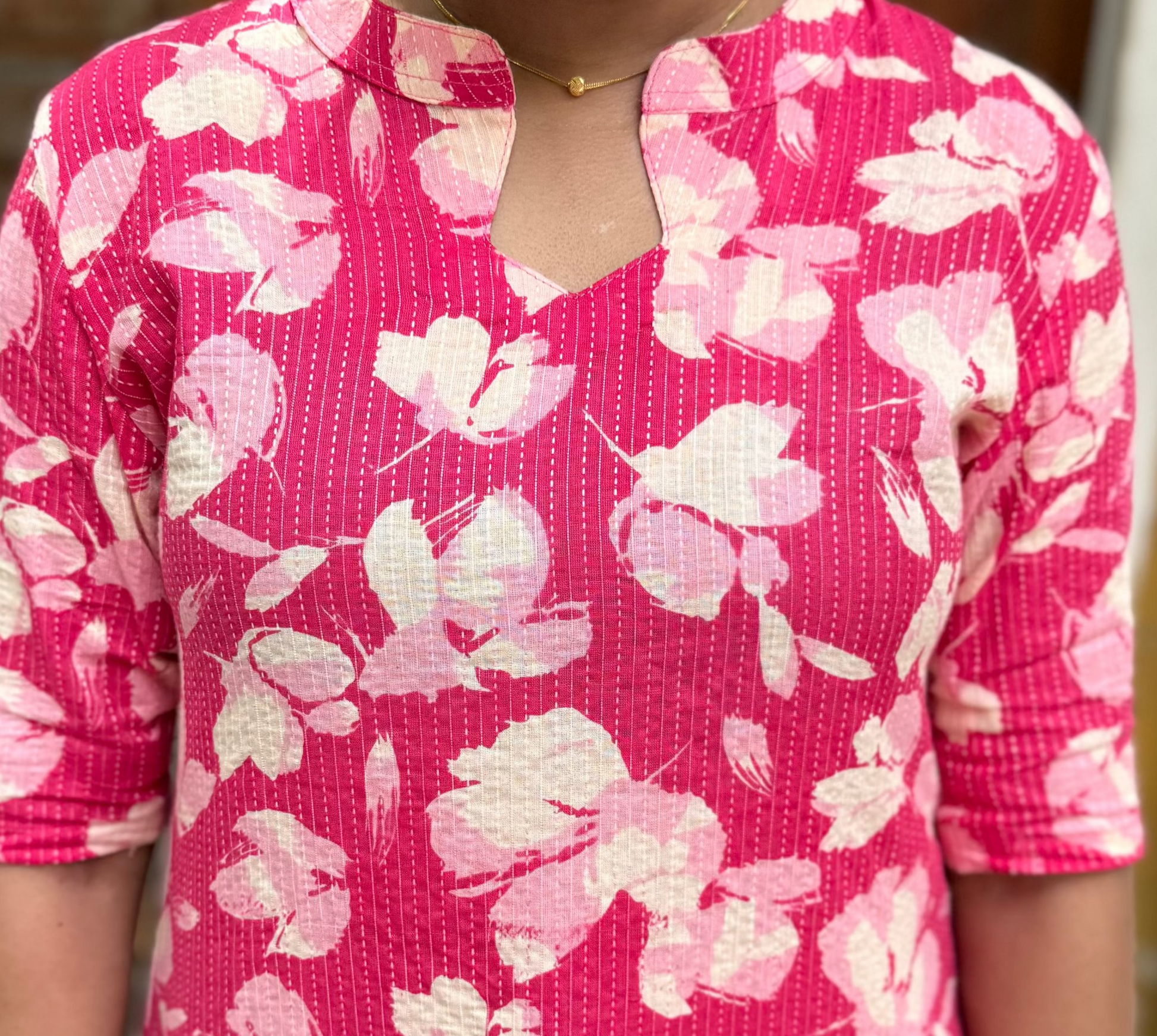 Description: Katha design kurti features a unique fish-shaped closed neckline. A perfect blend of tradition and contemporary style, ideal for both casual and festive wear.