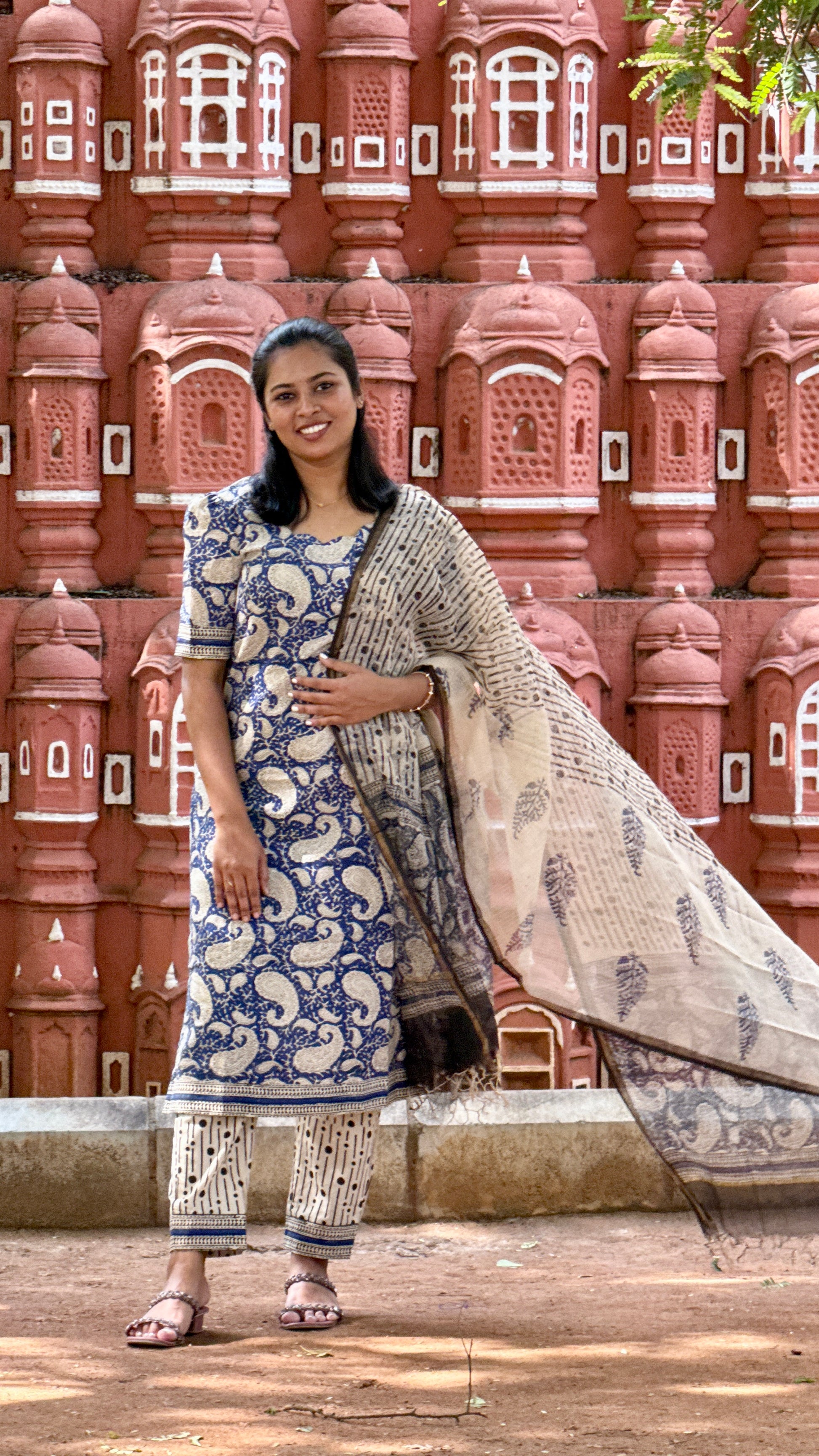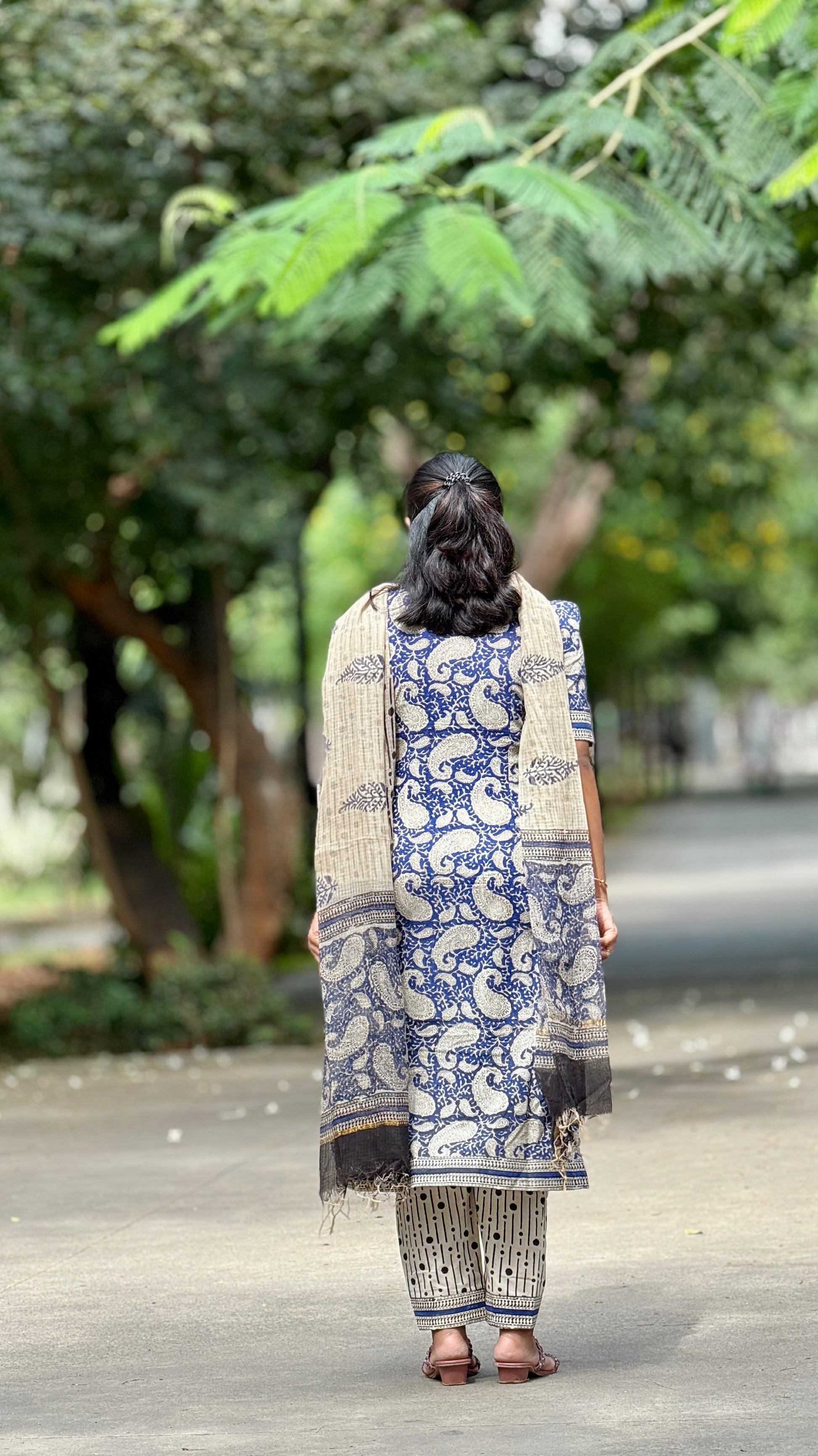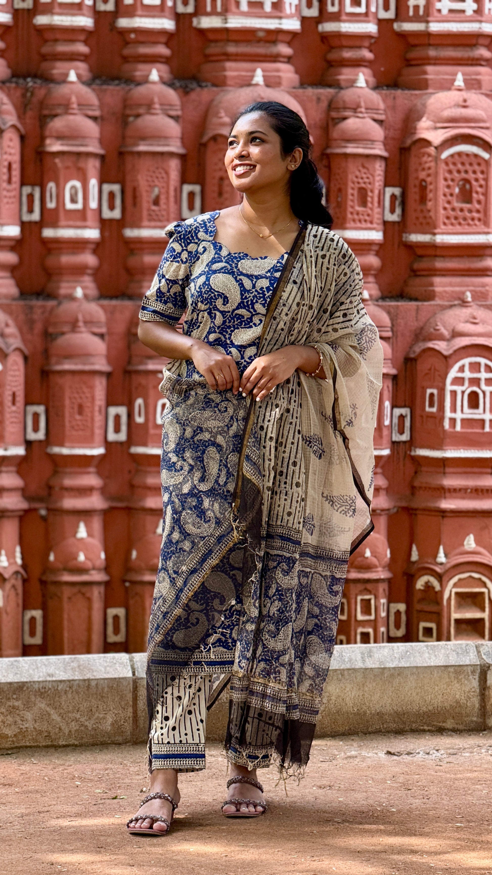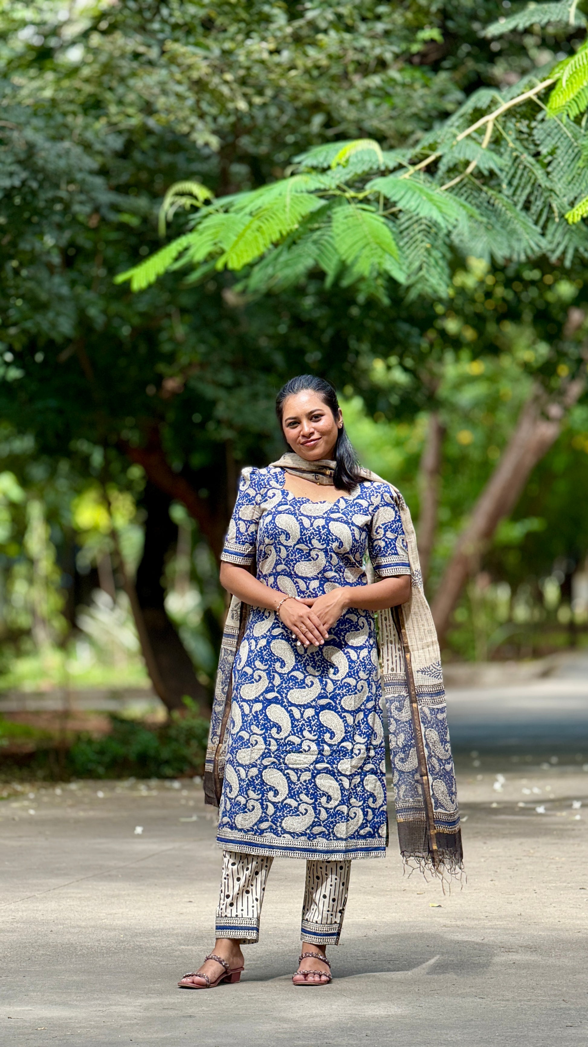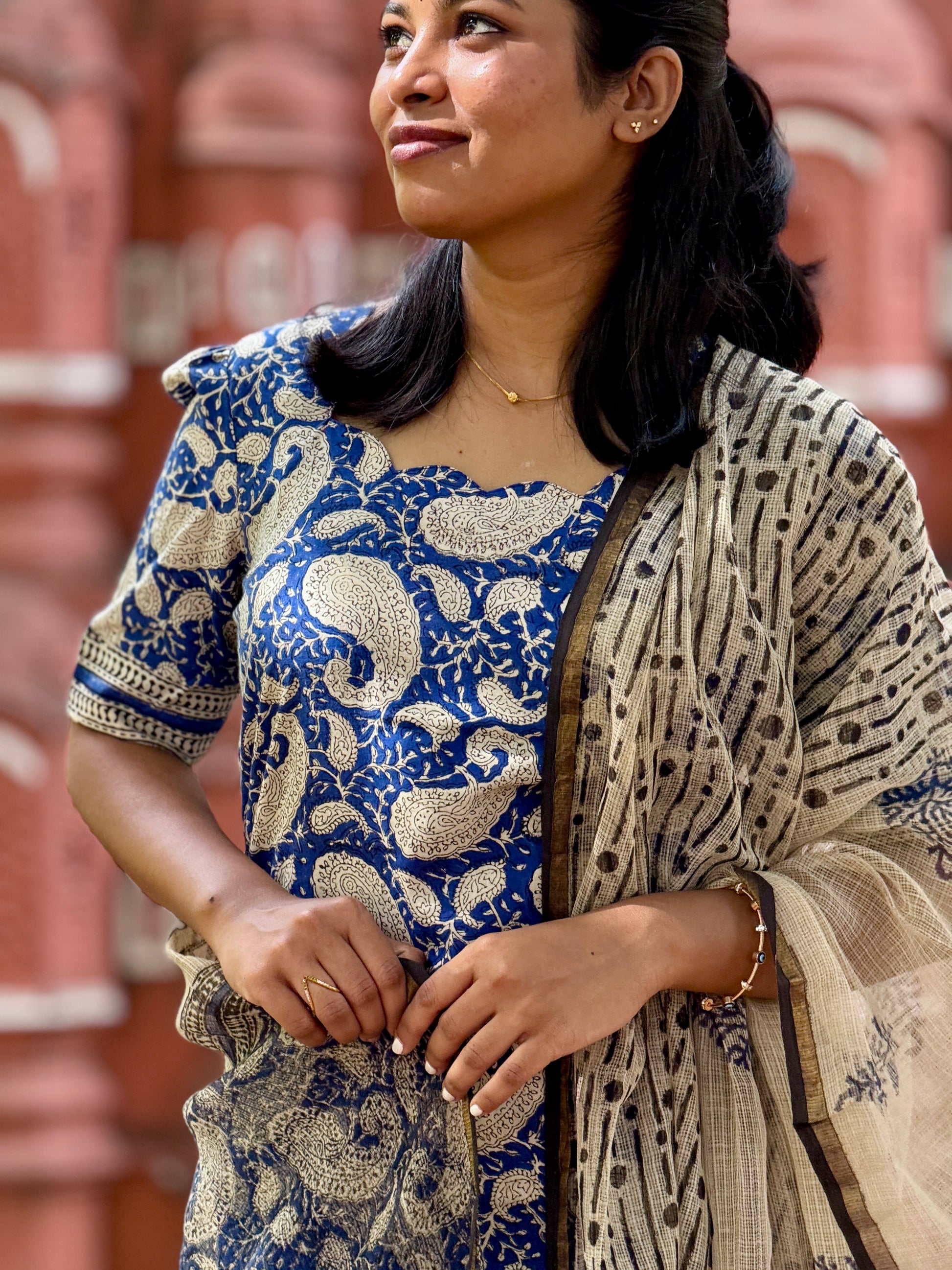 Description: A classic cotton salwar set with straight-cut pants, paired with a lightweight block-printed Kota Doriya dupatta. Finished with full scallop neckline, it offers the perfect mix of everyday comfort and timeless elegance.