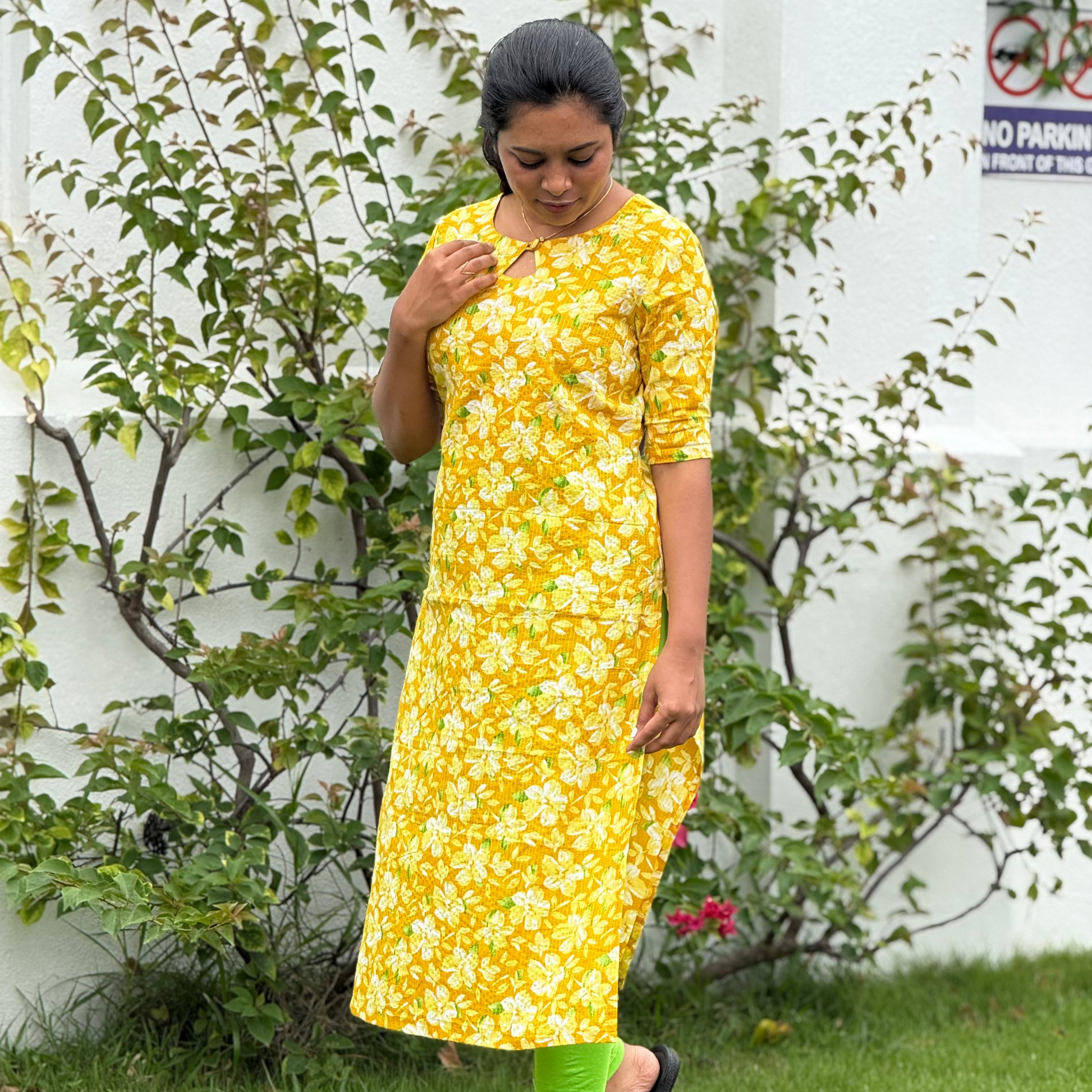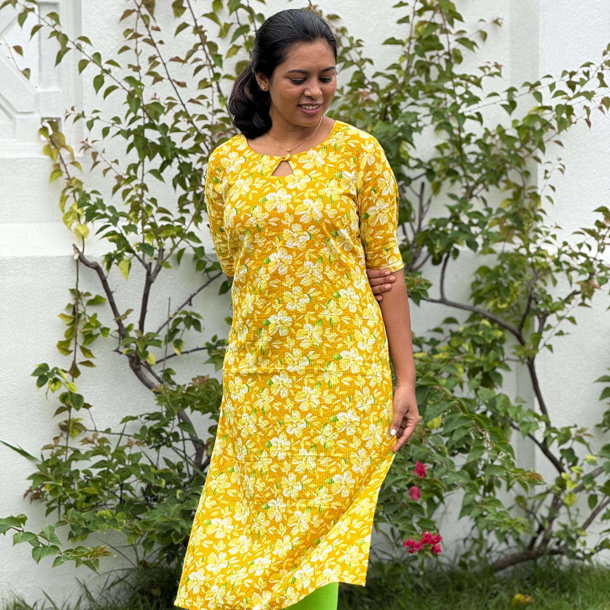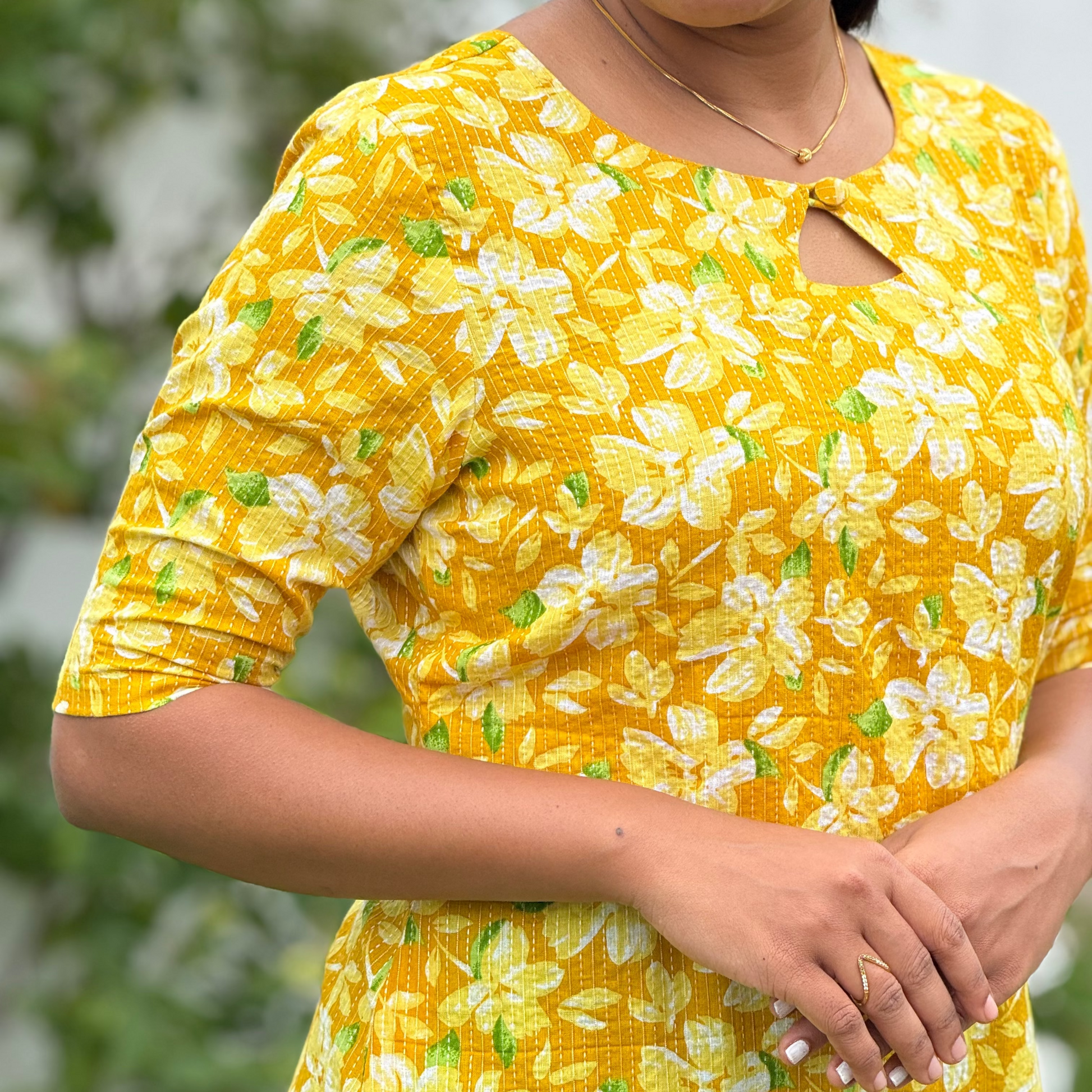 Description: Katha design kurti features a small triangular open with a self button, adding subtle charm to its traditional appeal.