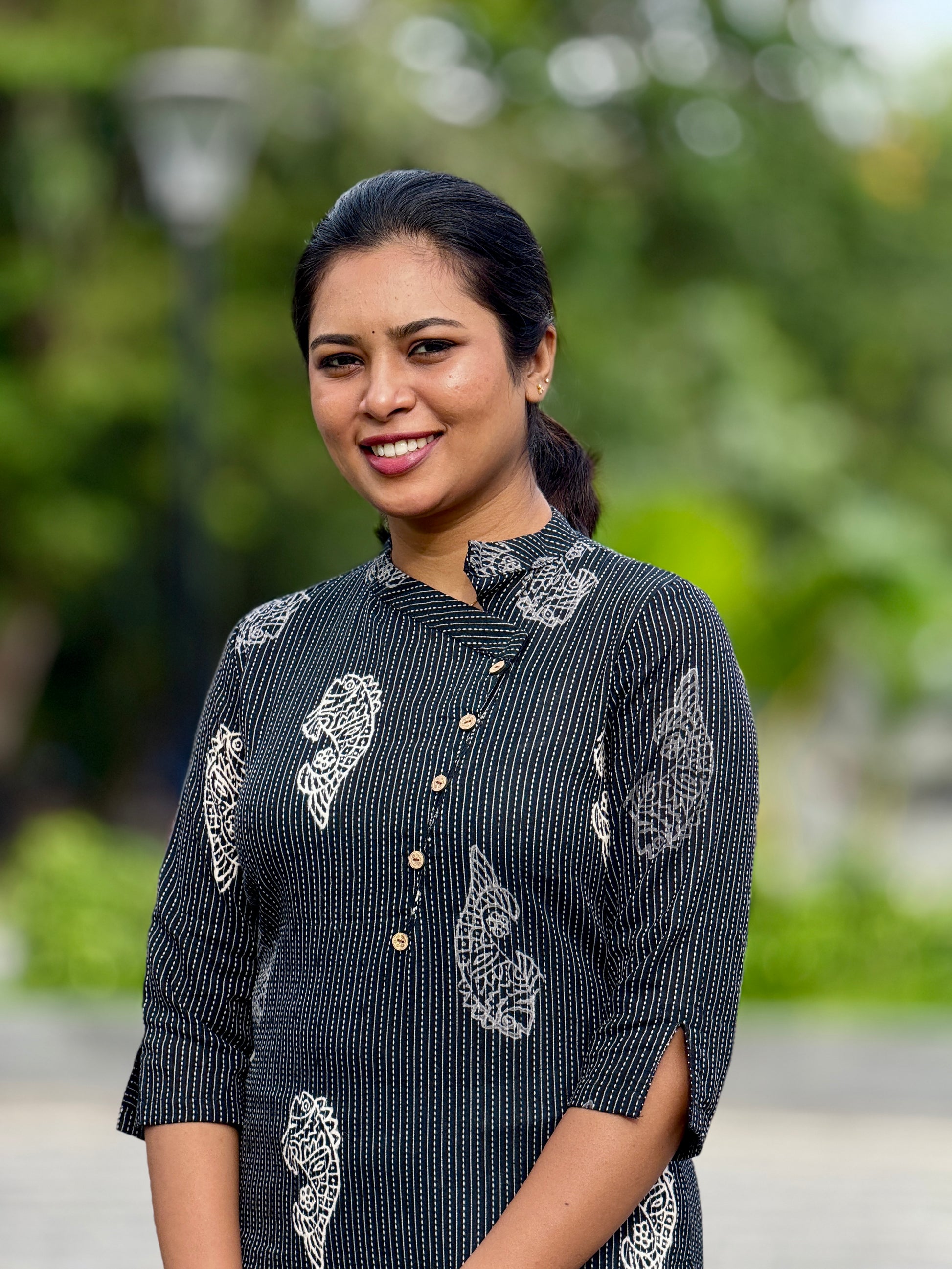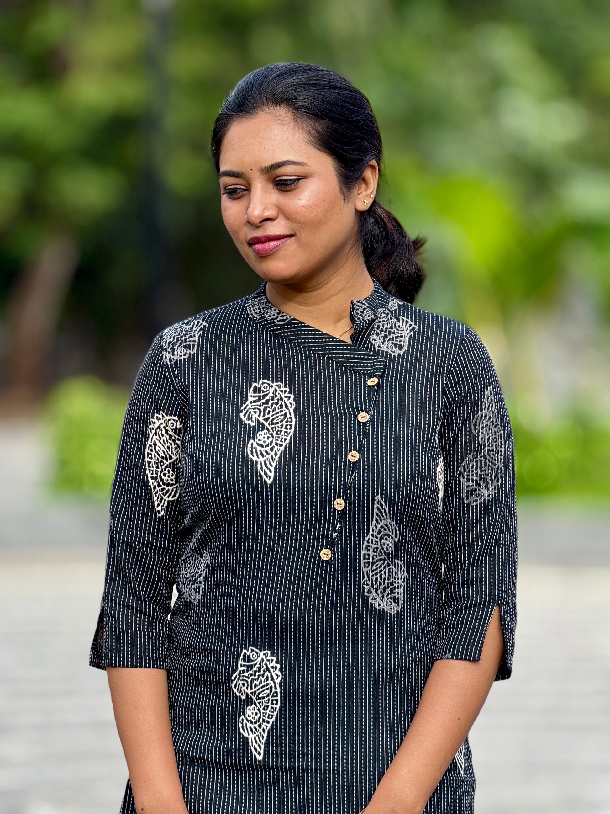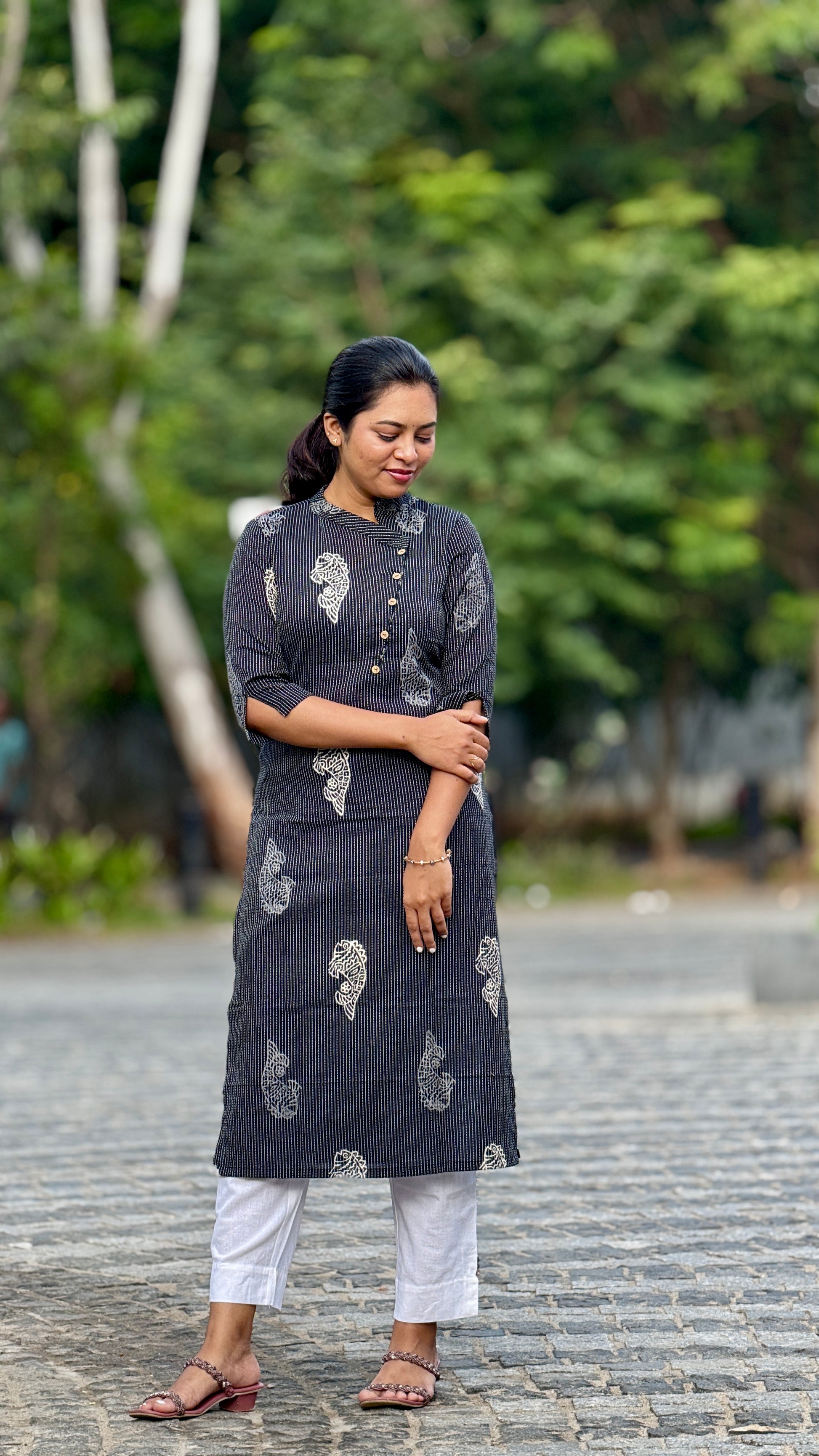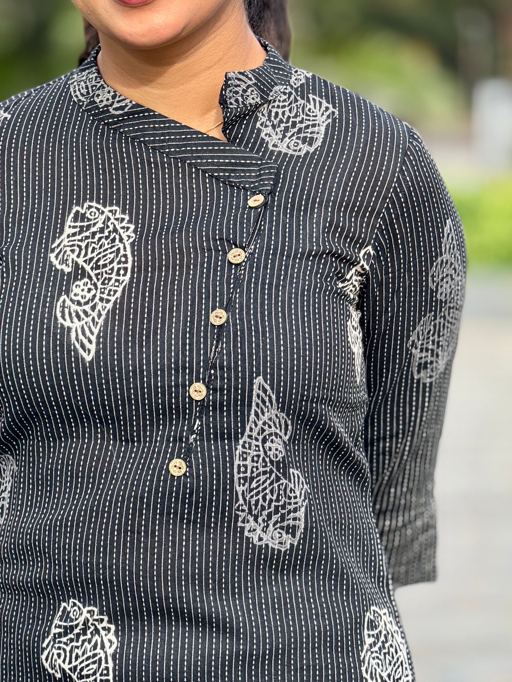 Description: Katha design kurti showcases fish-printed buttas and a stylish cross collar with wooden button finish. A perfect blend of traditional artistry and modern detailing for a standout look.